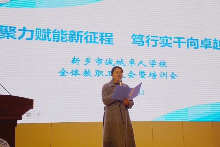 为深入落实教育高质量发展要求,锻造高素质专业化教师队 伍,锚定新学期教育教学发展目标,3月1日至2日,新乡市诚城卓人学校隆重召开教职工大会暨专题培训会。本次培训以“聚力赋能新征程,笃行实干向卓越”为主题,董事长邓志军出席会议,校长邢泰钢携全体中层以上领导全程参与,校长办公室主任李靖主持培训。全体教职工齐聚一堂、凝心聚力,共研教学之道,共谋发展之策。